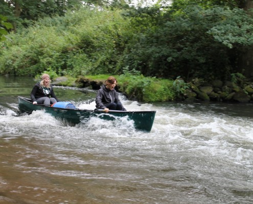 Nach ca. 20 Paddelminuten müssen Sie bereits die erste kleine Staustufe durchfahren. Das ist aber keinesfalls gefährlich sondern eher spaßig. Kurz darauf weist ein Hinweisschild darauf hin, dass das Luhmühlener Wehr nicht zu Umtragen sei. Braucht man auch nicht, denn mittlerweile gibt es dieses Wehr in Luhmühlen gar nicht mehr. Stattdessen befindet sich dort nach gut einer Stunde Paddelzeit ein ca. 100 Meter langer Abschnitt mit Stromschnellen, die man tunlichst im ausreichendem Abstand (wir empfehlen mindestens 50 Meter) zueinander befährt. Ansonsten kann es schon mal brenzlig werden, wenn ein Kanu dort kentert. Nachfolgende Boote können dann nämlich nicht einfach anhalten. Das passiert zwar sehr selten, aber trotzdem sollte man immer darauf hinweisen. Der Sicherheitsabstand bei erhöhter Geschwindigkeit wird ja auch beim Autofahren größer…